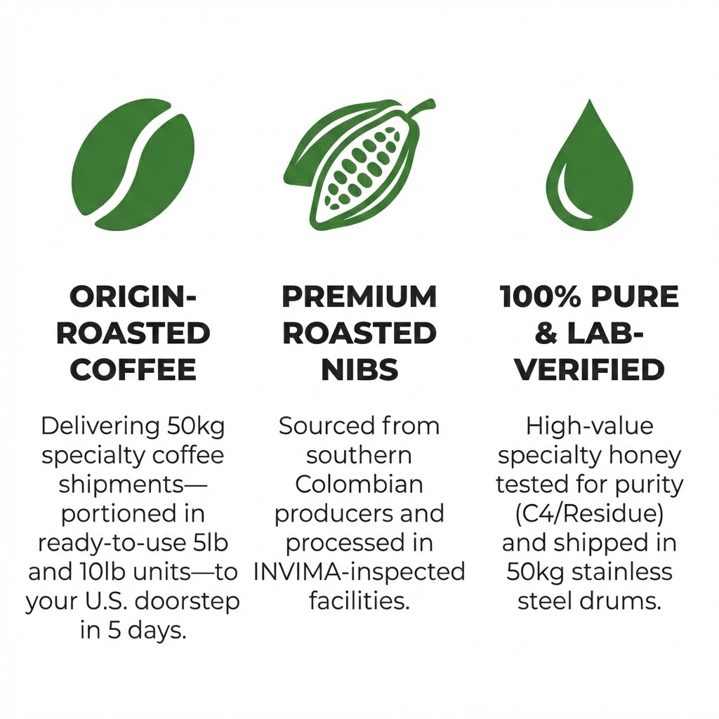 Delivering specialty-grade Coffee, Cacao, and Honey directly to your U.S. business in standardized 50kg units.